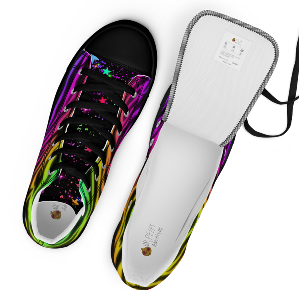Step into another dimension with every stride. These aren’t just shoes—they’re your portable portal to the Mr. Peeps universe. Bursting with electric rainbow waves, star-speckled skies, and a fearless black canvas frame, the Cosmic Pulse High-Tops channel energy for athletes, ravers, gearheads, dreamers, and spiritual wanderers alike.